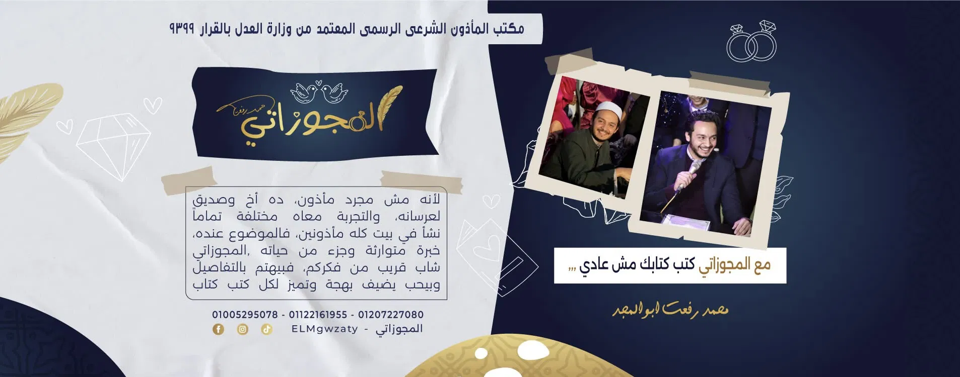 مع المجوزاتي🪶 كتب كتابك مش عادي💛 لأنه مش مجرد مأذون، ده أخ وصديق لعرسانه، والتجربة معاه مختلفة تماماً نشأ في بيت كله مأذونين، فالموضوع عنده، خبرة متوارثة وجزء من حياته ,المجوزاتي شاب قريب من فكركم، فبيهتم بالتفاصيل وبيحب يضيف بهجة وتميز لكل كتب كتاب 🎉